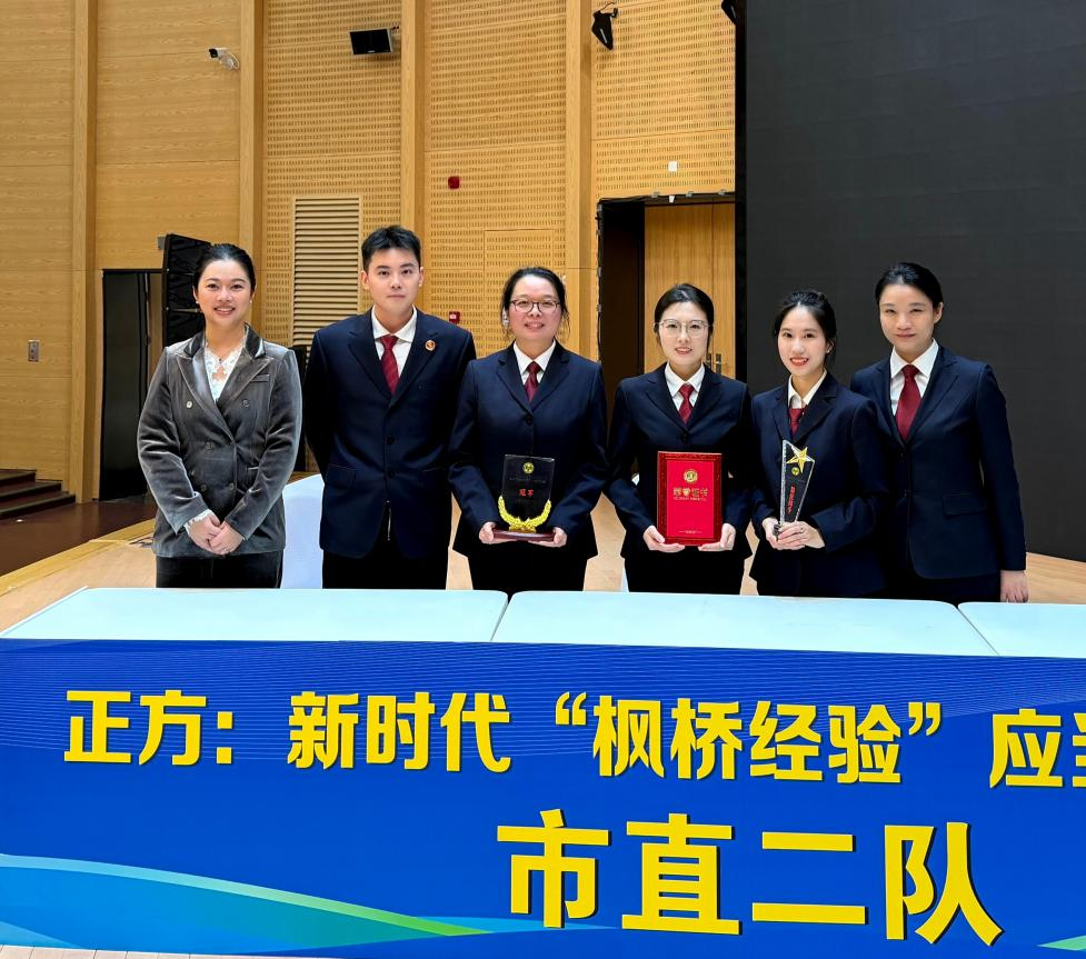 从初赛作为“一辩手”打败名声在外的新昌队,再到半决赛作为“三辩手”打败夺冠热门市直一队,傅蓉老师凭借扎实的法学功底、缜密的逻辑思维和出色的临场应变能力,全程发挥关键作用,获得评委和观众们的一致认可。在决赛中,市直二队围绕辩题“新时代‘枫桥经验’应当坚持优先”展开深入剖析,立论清晰、论证有力,尤其在自由辩论环节配合默契,攻防有序,最终以5:2的绝对优势夺得冠军,充分展现了傅蓉老师作为法律工作者的专业素养与精神风貌。